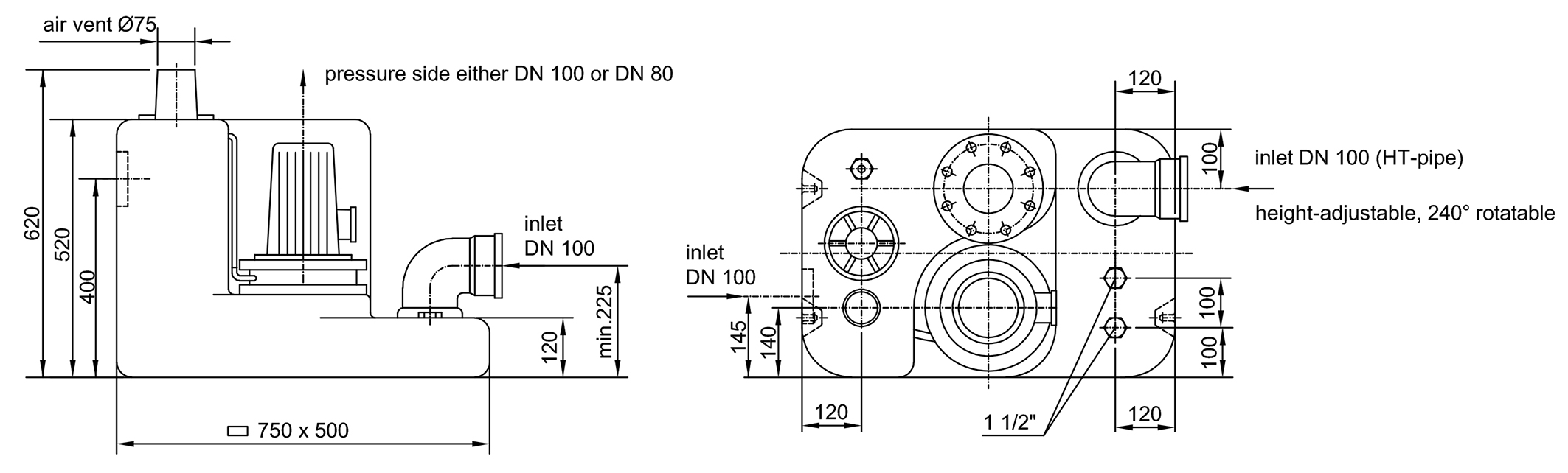 - connection flange piece DN 100 for pressure pipe (DN 80 optional) flexible connection with tension clamps for pressure pipe and ventilation pipe