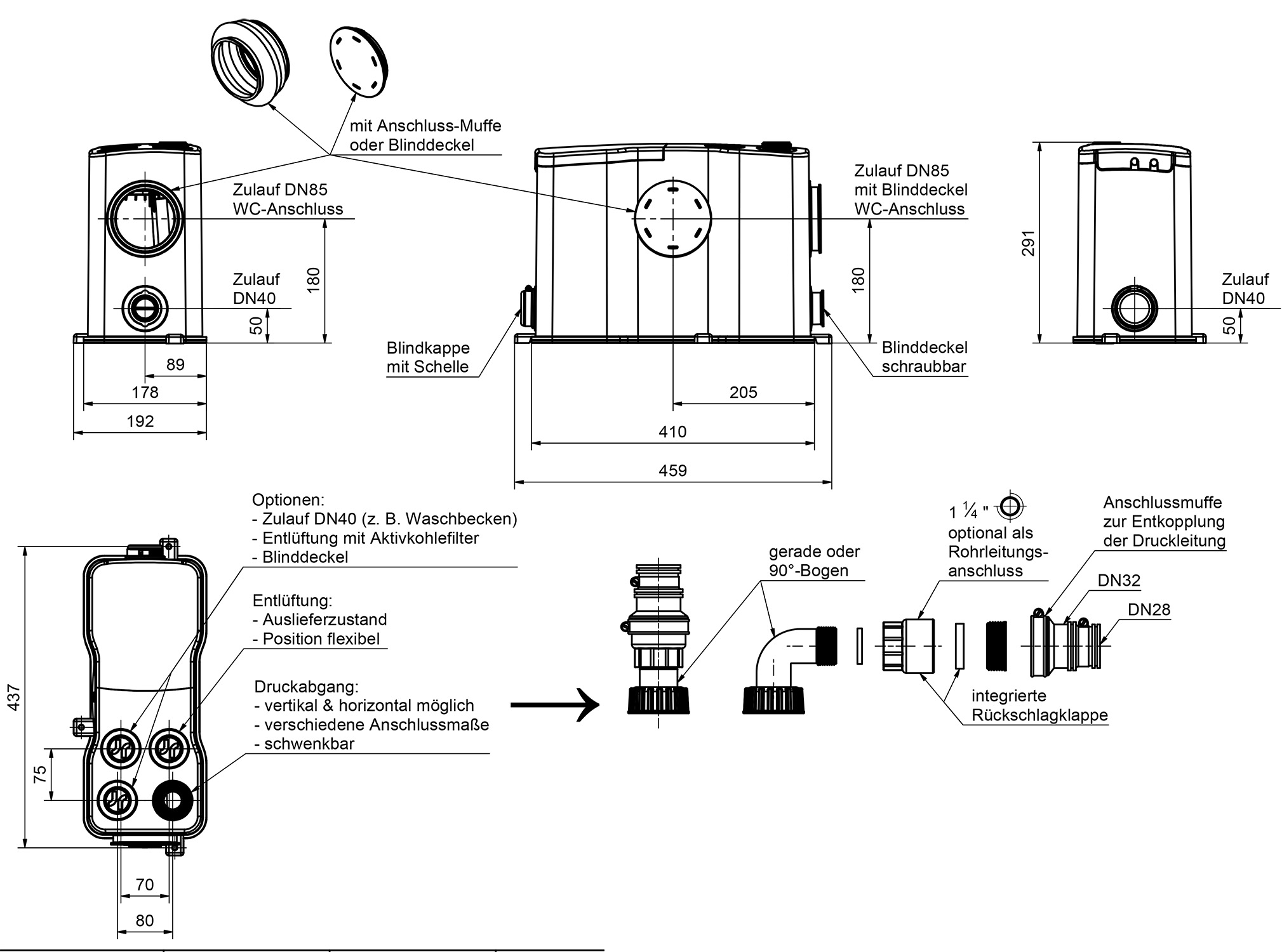 - Single WC lifting station for limited use in private households below backflow level, e.g. in basements or during renovation of old buildings