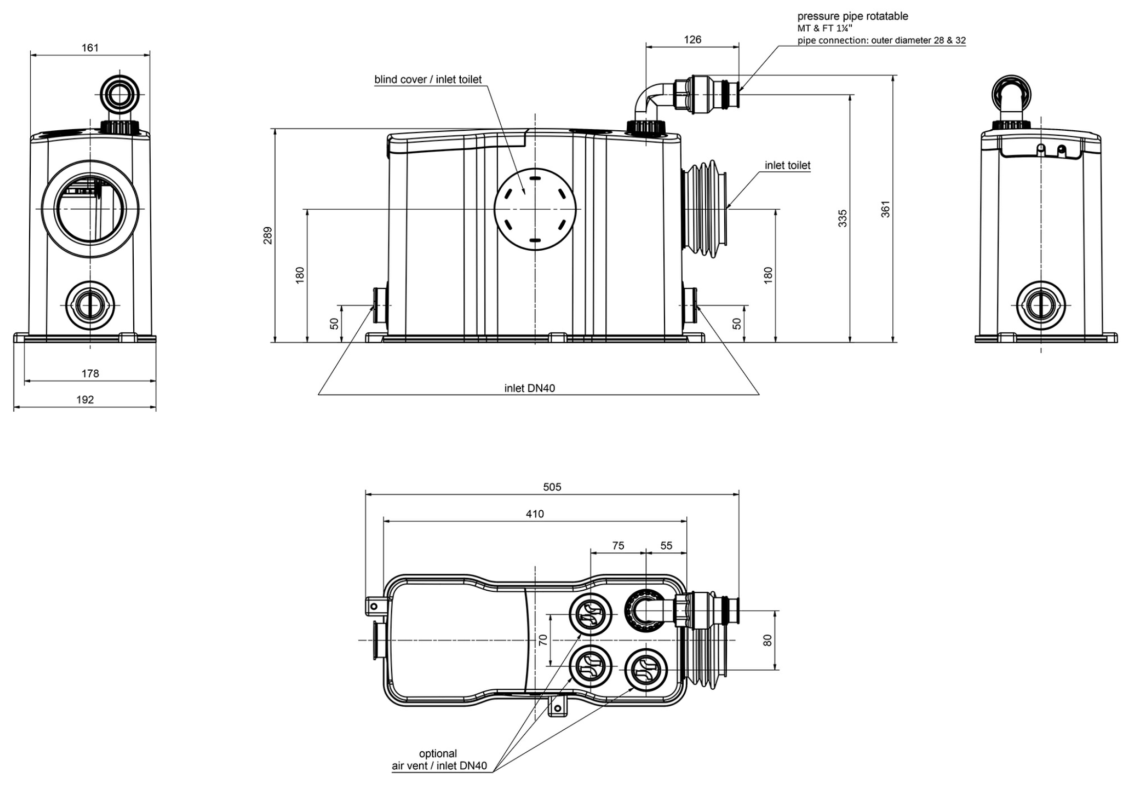 - Accessories: anti-buoyancy device, inlet socket DN 40, pressure outlet 1 1/4“ female/male thread, Ø32 and Ø40 connection